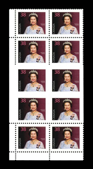 1325 nhPB 1164c image#1164c, 1988 38c Queen Elizabeth II, vertical block of ten, middle pair imperforate, second and fourth pairs partially perforated, this being a bottom left corner block, which is considered a non-inscription plate block, a striking error caused by a perforation shift that puts the gutter between panes in the center of the block, o.g., n.h., extremely fine; only 40 blocks were produced thus (Unitrade C$1,750.00). (Image) $1,000.00+