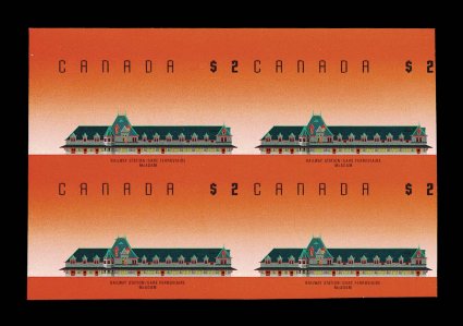 1326 nhPB 1182a image#1182a, 1989 $2.00 McAdam Railway Station, imperforate, top left corner sheet-margin block of four, which is considered a non-inscription plate block, brilliant color, fresh, o.g., n.h., extremely fine (Unitrade C$3,250.00). (Image) $1,800.00+