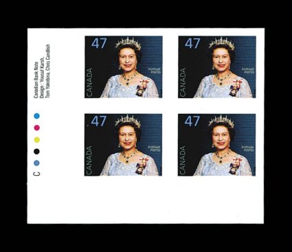 1328 nhPB 1683a image#1683a, 2000 47c Queen Elizabeth, imperforate, bottom left inscription block of four, fresh and bright. o.g., n.h., extremely fine; catalog value is for two imperforate pairs (Unitrade C$1,800.00+). (Image) $1,200.00+