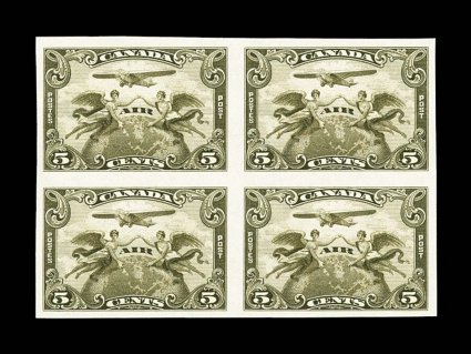 1329 nhbl C1a image#C1a, 1928 5c Brown olive air post, imperforate, attractive block of four with large even margins all around, o.g., n.h., owner's small "HHH" handstamp on each stamp, extremely fine (Unitrade C$600.00+). (Image) $500.00+