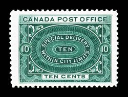 1331 nh E1 image#E1, 1898 10c Blue green special delivery, an incredible jumbo-margined mint example, sporting gigantic margins all around, being especially wide, and remarkably well centered within these vast borders, rich luxuriant color, pristine o.g., never hinged, an extremely fine gem (Unitrade C$390.00). (Image) $200.00