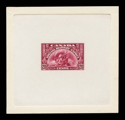 1332 P E6P image#E6P, 1935 20c Dark carmine special delivery, die proof on India, die sunk on original card measuring 4 1/4"x4 1/8", beautifully fresh with rich intense color, extremely fine; much rarer than the 198 plate proofs or the 20 gutter pairs associated with them; unlisted. (Image) Est. 500-750