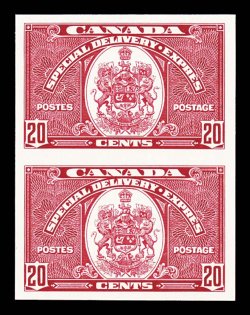 1333 nh E8a image#E8a, 1938 20c Dark carmine special delivery, imperforate, vertical pair, very large even margins all around, deep rich color, o.g., n.h., extremely fine and choice; only 50 pairs recorded (Unitrade C$1,125.00). (Image) $650.00