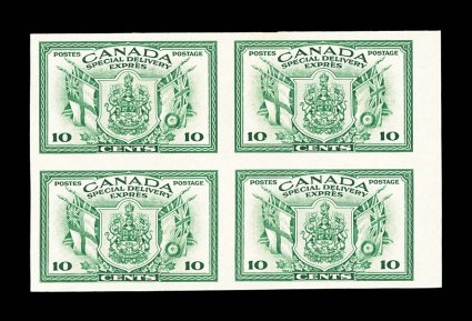 1334 nhbl E10a image#E10a, 1942 10c Green special delivery, imperforate, right sheet-margin block of four, other margins are wide and even as well, o.g., n.h., owner's small "HHH" handstamp on each stamp, extremely fine; only 75 pairs printed (Unitrade C$2,250.00) (Image) $1,300.00