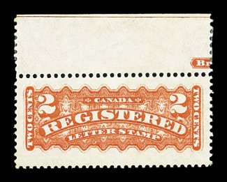 1335 nh F1 image#F1, 2c Orange registration stamp, a striking top sheet-margin partial imprint single, possessing margins of incredibly size and being wonderfully well centered within these immense borders, gorgeous bright color, immaculate o.g., never hinged (hinged in the selvage only), an extremely fine gem with great eye-appeal; 2001 PF certificate (Unitrade C$375.00). (Image) $170.00