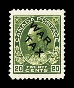 1336 nh MR2C imageUnitrade #MR2C, 1915 20c Olive green with "WAR TAX" overprint, exceedingly well centered within large margins which is most uncharacteristic of these, as most are found quite off center, strikingly rich color and a crisp detailed impression, o.g., n.h., extremely fine; a very scarce stamp to find in this outstanding condition. (Image) Unitrade C$250.00