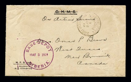 1339 c imageCanadian Expeditionary Forces in Siberia, an incredibly scarce group of five covers all bearing "Field Post Office/Canadian/Siberian Exp. Force" c.d.s., three are addressed to Canada, one to the U.S. and one to England, the one to England is a great censored post card illustrating "The Majestic Sight of the Allied Naval Fleet in the Port of Vladivostock", the cover to the U.S. has a "Canadian/Y.M.C.A corner card, one cover to Canada (slight repairing) bears the extremely scarce "Base Depot/May 5 1919/Siberia" violet circular handstamp (great strike); small cover faults, overall fine or better; one Canadian "Polar Bear" cover is a find, five highly interesting covers in one lot is a rare opportunity. (Image) Est. 500-750