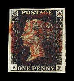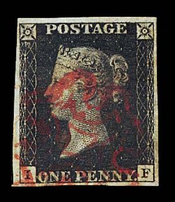 1382 O 1 image#1, 1840 1p Black, plate 5, lettered K-F, exceptionally attractive used example with extra-large to huge margins all around, sharply engraved impression with strong black color, light red Maltese Cross cancel, extremely fine and unusually choice (S.G. #2; £190). (Image) $190.00