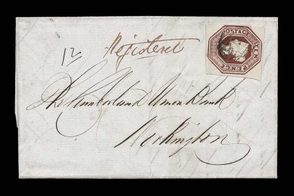 1385 c 6 image#6, 1848 10p Red brown, die 2, unusually large margined single on 1855 registered entire, not tied but clearly proper to the cover with rim of central light numeral oval cancel impressing the the paper of the cover, from Liverpool, backstamped Workington, extremely fine and rarely found this nice; 1997 Brandon certificate (S.G. #57; for on cover £1,500). (Image) $1,200.00