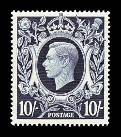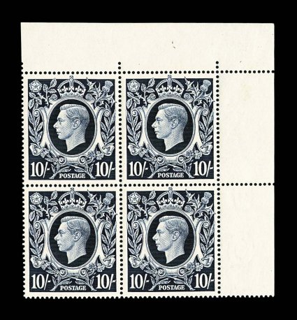 1387 nhbl 249-51A, 275 image#249-51A, 275, 1939-48 2/6 to £1 King George VI and Royal Arms cplt. in blocks of four, the key 10/- Indigo is a corner margin block, o.g., n.h., fresh and very fine (S.G. #476-78b; £1,100). (Image) $1,486.00+