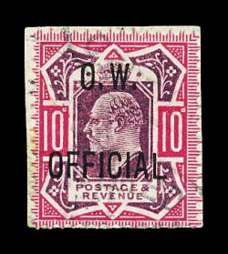 1388 O O53 image#O53, 1902 10p Carmine rose and violet, with "O.W./OFFICIAL" overprint, tied to piece by an unusually light cancel, attractive color, very fine; one of the rarest and most elusive of all the official overprints; 1999 BPA certificate (S.G. #O40; £3,500). (Image) $4,000.00