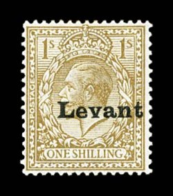1389 og S.G. #S2, 4, 5-8 imageS.G. #S2, 4, 5-8, 1916 1p to 1/- King George V with "Levant" overprints, six values from the set issues for a British Post Office in Saloncia, o.g., 1/- with faint corner bend, a fine-very fine group of these scarce stamps; 1993 Holcombe certificate. (Image) S.G. £875