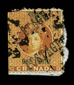 1390 O 14a image#14a, 1883 Half of 1p Orange bisect used as 1/2p, unsevered pair with large "POSTAGE" overprint, tied to small piece by portions of c.d.s. cancels, full perforations all around although scissors separated at left to keep the entire design intact, strong colors, very fine; this is a rare overprint in unsevered pairs used as 1p; signed Rendon and accompanied by a 1994 BPA certificate (S.G. #28a; £1,200). (Image) $1,300.00