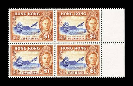 1395 nhbl 168-73 image#168-73, 1941 2c-$1.00 King George VI Pictorials cplt. in margin blocks of four, well centered, o.g., n.h., fresh and very fine (S.G. #163-68; £280+). (Image) $380.00+