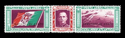 1400 nh CO1 image#CO1, 1933 Balbo air post official triptych, bright colors, o.g., n.h., some natural gum bends as often found on these, very fine and scarce; signed A. Diena and accompanied by his 1968 certificate (Michel #D9; €3,000). (Image) $2,000.00