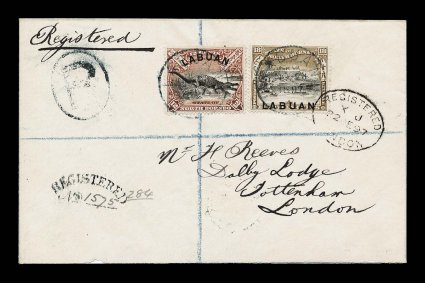 1406 c 80, 83 image#80, 83, 1897 12c Red and black and 18c Bister and black, neatly tied to registered cover to London by blue black "Labuan/NO 23, 1897" c.d.s., 18c also tied by the oval London registry pmk., backstamped Tottenham, very fine and choice cover (S.G. #95a, 99a). (Image) Est. 200-300