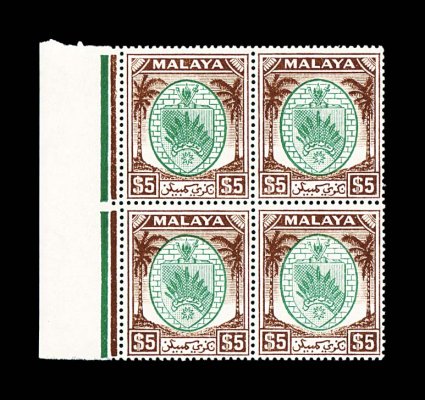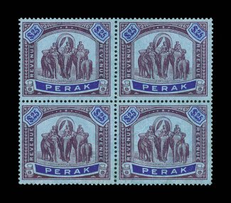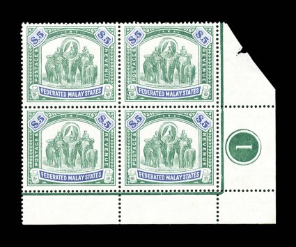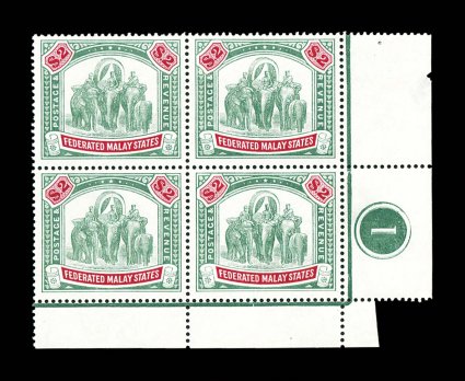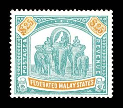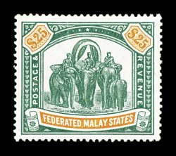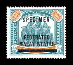 1410 S S.G. #11s/82s imageS.G. #11s/82s, 1895-1928 Malaya Elephant and Howdah high value "Specimen" overprint collection, consisting of twelve mostly different of the Federated States including the four values of the 1900 overprinted issue with two examples of the $25.00 key value (one thin), and the four values with vertical "Specimen" overprint of the 1900 unoverprinted issue, also $1.00, $2.00 and $25.00 of the last 1922-34 issue, also includes four values of the same design of Perak including the $25.00 (S.G. #76-77, 79-80), o.g., few h.r., fine-very fine or better. (Image) S.G. £1,380+