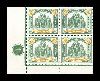 1414 og/nhbl 37 image#37, 1910 $25.00 Green and orange, watermarked multiple Crown and "CA", impressive and extremely rare bottom left corner sheet-margin block of four showing plate no. 1, each stamp is incredibly well centered, possessing wonderful freshness, strong luxuriant colors, o.g., light hinging in three stamps, the top left stamp is never hinged, extremely fine; an amazing multiple of this key high value and most desirable in this unusually choice condition; 2001 RPS certificate; ex-Royal Collection (S.G. #51; £4,400). (Image) $5,600.00