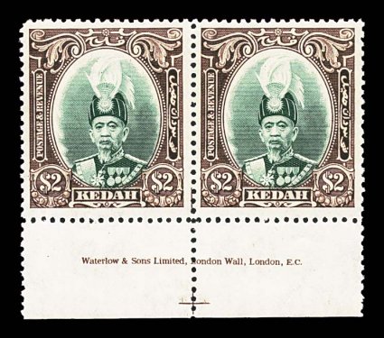1416 nh 46-54 image#46-54, 1937 10c-$5.00 Sultan of Kedah cplt. in matched bottom margin imprint pairs, bright and fresh, well centered, o.g., n.h., very fine (S.G. #60-68; £400+). (Image) for hinged $372.00+