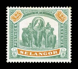1422 og 41 image#41, 1899 $25.00 Green and orange, fresh colors, nicely centered, o.g., h.r., certificates mentions "minor tone spots" which are so faint as to be completely unworthy of mention, still a very fine example of this scarce high value; 2004 BPA certificate (S.G. #66; £2,500). (Image) $1,400.00