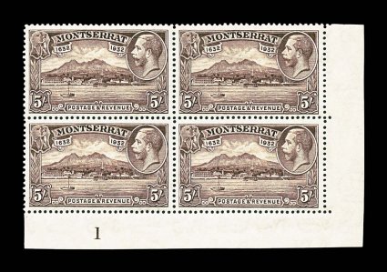 1431 nhbl 75-84 image#75-84, 1932 1/2p-5/- Tercentenary cplt. in matched bottom right corner margin plate no. 1 blocks of four, well centered and fresh, o.g., n.h., very fine; actually a difficult set to find in never hinged blocks; 5/- signed Bolaffi. (S.G. #84-93; for hinged £600). (Image) $1,300.00+