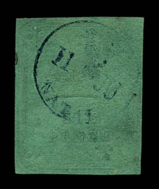 1432 O 2 image#2, 1857 6p Embossed on green, used, full strong embossing, margins just clear of design, central blue c.d.s., current certificate notes minor thins which may be natural paper irregularities, very fine for this difficult stamp; 1930 and 2004 BPA certificates (S.G. #5; £1,100). (Image) $1,300.00