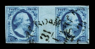 1433 O 1 var. image#1 var., 1852 5c Blue, horizontal interpanneau pair, being positions 5 and 26 from Plate III, large margins all around, deep rich color and a crisp detailed impression, Amsterdam c.d.s. postmarks, very fine.The interpanneau pairs are the key rarities of the first issue of Netherlands, as only a few examples of each value are known. The rarity of these pairs becomes evident when one realizes that some of the greatest collections of all time lacked them. Ferrary and Caspary did not have any examples, and even the Burrus collection, which had many Netherlands first issue rarities (including full mint panes of twenty-five of all three values) did not have a single interpanneau pair. Further contributing to this particular pair's rarity is the fact that there is no crease in the interpanneau, as nearly all other examples have a crease.An important showpiece of classical Europe and a cornerstone for a Netherlands First Issue exhibit. Accompanied by a 2004 Dr. Louis certificate. (Image) Est. 15,000-20,000