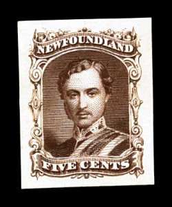 1436 E 27E image#27E, 1865 5c Prince Albert, plate essay, in brown, on India on original card backing (small thinning to the card only), very rare essay in the same design as the 10c Black only with a "Five Cents" value inscription instead of the issued "Ten Cents", full wide margins all around, extremely fine. (Image) Est. 750-1,000