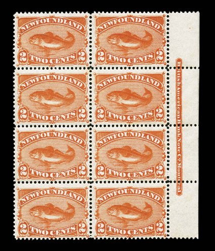 1439 og/nhbl 48 image#48, 1887 2c Red orange, right sheet-margin inscription block of eight, brilliant color and a sharp impression, quite well centered, full fresh o.g., technically never hinged, but four stamps with minute gum disturbances, overall very fine and a scarce position piece (Unitrade C$640.00 as four hinged and four never hinged singles). (Image) Est. 400-500