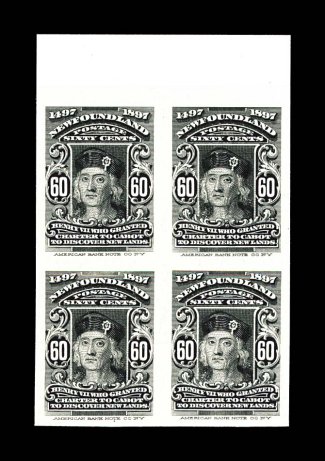 1440 P 61P-74P image#61P-74P, 1897 1c-60c Discovery of Newfoundland, plate proofs on India cplt. in blocks of four, on original card backing, all but the 1c value are sheet-margin blocks, brilliantly fresh with excellent colors, uniform wide margins, extremely fine; catalog value is for four sets of singles. (Image) Unitrade C$3,000.00+