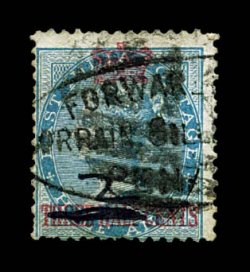 1482 O 9A image#9A, 1867 "2" Manuscript surcharge on 1 1/2c on 1 1/2a Blue, used, cancelled with an unusual oval forwarder's handstamp rather than the typical "D17" postmark of Penang, small thin spot, still fine for this rare and difficult stamp; clear 1958 BPA certificate (S.G. #10; £4,250). (Image) $5,000.00