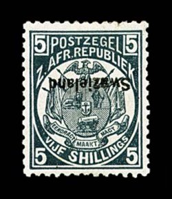 1484 og 7a image#7a, 1889 5/- Slate, "Swazieland" inverted overprint, overprint position 14 inverted on stamp position 47, showing broken right leg of "w", well centered, deep intense color on fresh white paper, o.g., h.r., trivial margin tear at top, otherwise very fine and an attractive example of this rare error; clear 1991 BPA certificate (S.G. #8a; £1,600). (Image) $1,900.00