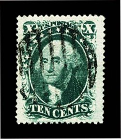 161 O 35 var. image#35 var., 10c Dark Green, Ty. V, gem used single, exceedingly well centered within extra-large margins, incredibly deep luxuriant color in a dark green shade, neat light strike of a black grid cancel, extremely fine; 1988 PF certificate for a vertical pair, this being the top stamp, with generic green designation. (Image) $70.00