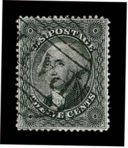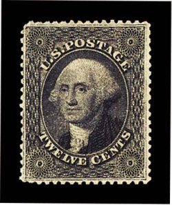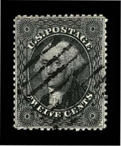165 O 36b image#36b, 12c Black, plate III, incredibly well centered used example within near perfectly balanced margins, the side margins being of jumbo proportions, amazingly intense "jet" black color with a strong impression, bold black rimless grid cancels, extremely fine; a gem single of this notoriously difficult stamp to find in such premium condition; 1988 PF certificate. (Image) $225.00
