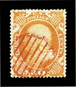 171 O 38 image#38, 30c Orange, incredibly well centered used single, brilliant intense color and a sharp impression on bright paper, lightly cancelled by red grid cancels, very fine and a pretty stamp. (Image) $490.00