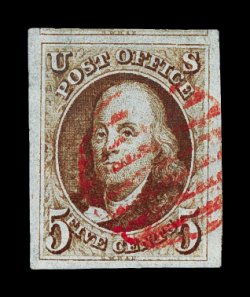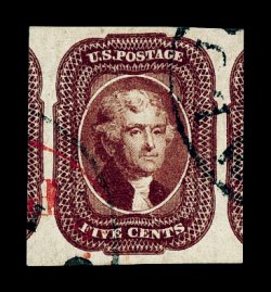 8 O 12 image#12, 5c Red brown, a spectacular used example of this imperforate classic, with absolutely enormous margins all around, including showing significant portions of the adjoining stamps at sides, gorgeous intense color and a crisp impression on especially bright paper, beautifully cancelled by two light strikes of black town c.d.s. which flank either side of the central vignette (leaving it cancel free), plus a portion of a red postmark at left, superb; a perfect stamp for the collector who seeks out stamps only in the most extraordinary condition; 1999 PF certificate. (Image) $1,050.00