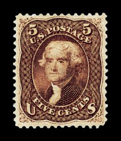 10 og 76 image#76, 5c Brown, a magnificent mint example of one of the most difficult 19th century stamps to find in truly gem quality, as the vast majority of examples are found with narrow margins, off-center, and/or with faults, this particular example, however, possesses outstanding centering within incredibly large margins for this tightly spaced stamp, strong rich color, full original gum, lightly hinged, extremely fine; easily one of the finest mint #76's in existence; 2002 PF certificate. (Image) $1,400.00