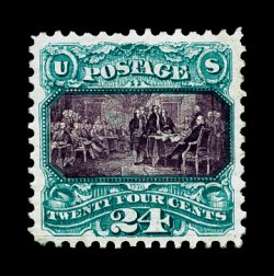 13 og 130 image#130, 24c Green and violet re-issue, a highly desirable mint example of this very scarce re-issue, featuring beautiful vibrant colors and strong detailed impressions on clean white paper, plus it is extraordinarily well centered within large margins, full o.g., extremely fine; among the finest of the 2,091 issued; 2002 PF certificate. (Image) $2,750.00
