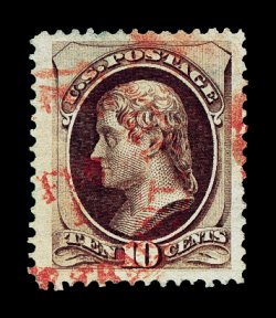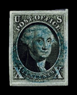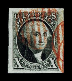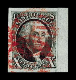 3 O 2 image#2, 10c Black, a phenomenal used example in the finest attainable condition, being from position 60L showing an enormous sheet margin at right, with truly huge margins all around including a part of the adjoining stamp at top, stunning rich color and an incredibly detailed impression on lightly blued paper, all wonderfully complemented by red grid cancels, a superb gem; this extraordinarily stamp is widely regarded as one of the finest used Ten Cent 1847 stamps in existence, with every aspect of this stamp being absolutely perfect; 2000 PF certificate; ex-Wall. (Image) $1,350.00