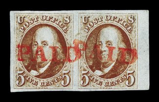 2 O 1b image#1b, 5c Orange brown, an absolutely magnificent used right sheet-margin horizontal pair, with the left stamp showing the dot in "S" variety, every aspect of this pair is simply incredible, starting with its dazzling true orange brown color and outstanding detailed impression on bright crisp paper that still retains much of its original bluing, equally impressive are this pair's extravagantly large margins all around, including a sizable sheet margin at right, magnificently cancelled by two perfect strikes of bold red straight line "PAID" cancels, placed neatly on each stamp, truly a superb pair which possesses tremendous eye appeal; one of the most famous condition rarities found on the Five Cent 1847 Issue; 1974 PF certificate as Brown orange, photocopy of a 1994 PF certificate as Orange brown, as well as a 1994 letter from the PF clarifying that this is indeed the Orange brown shade; ex-Morris, Mayer. (Image) Est. 5,000-7,500