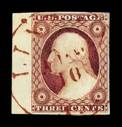 7 O 11 image#11, 3c Dull red, large to huge margins all around, including a sizable sheet margin at left, excellent clarity of impression and unusually strong color in a deep shade, beautifully postmarked with a socked-on-the-nose red town c.d.s., extremely fine; a lovely used gem; 2001 PSE certificate. (Image) $17.50