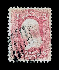 9 O 64a image#64a, 3c Pigeon blood pink, an exceptional quality example of one of the rarest shades in all of 19th century philately, and certainly one of philately's most unique color identifications, being in a condition which places it among the finest used examples extant, outstanding centering for the issue within large margins, but most impressive is this stamp's radiant rich shade with the obvious bluish undertones that are essential to identify this as a Pigeon blood pink, crisp impression as well on bright paper, grid pmk., very fine and exceedingly choice; a stamp that is missing in even the most advanced collections; 2001 PF certificate. (Image) $3,750.00