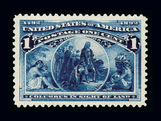 26 nh 230 image#230, 1c Columbian, jumbo mint single, with four huge margins and being perfectly centered amid these uncharacteristically large borders, rich luxuriant color on bright paper, o.g., n.h., an extremely fine gem for the perfectionist; 1991 PSE certificate. (Image) $50.00