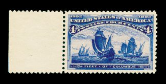 29 nh 233 image#233, 4c Columbian, a magnificent left sheet-margin mint single, featuring extraordinarily large margins all around, and beautifully centered amid this vast expanse, glorious rich color and a prooflike impression, o.g., n.h., extremely fine; this pristine gem is easily one of the most visually striking mint Four Cent Columbians we have seen; 1994 PF certificate. (Image) $200.00