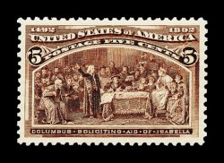 30 nh 234 image#234, 5c Columbian, an especially choice mint example, being extraordinarily well centered within unusually large margins, but equally impressive is this stamp's prooflike color and impression on brilliantly fresh paper, pristine o.g., n.h., an extremely fine gem; 1999 PF certificate. (Image) $220.00