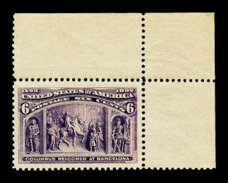 31 nh 235 image#235, 6c Columbian, the top right corner sheet-margin single offered here is certainly one of the most spectacular mint examples in existence, as it boast numerous eye-arresting physical qualities, not the least of which are its gigantic margins all around, and precise centering within these incredible borders, its color is especially deep and rich, while its impression is razor sharp, unblemished o.g., never hinged, superb; an incomparable gem for the collector who has been patiently seeking out the "ultimate" Six Cent Columbian; 1992 PF and 2002 PSE certificates. (Image) $195.00