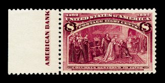 32 nh 236 image#236, 8c Columbian, a visually striking left sheet-margin partial imprint single, in a remarkably pristine state, with gorgeous intensely rich color and a deeply etched impression on immaculate white paper, plus it is marvelously well centered within lavishly large margins which are most uncharacteristic of this value, o.g., n.h., an extremely fine gem in every regard; 1998 PF certificate. (Image) $175.00