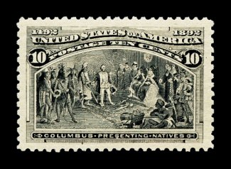 33 nh 237 image#237, 10c Columbian, a spectacular mint example the likes of which we had never seen before, as this breathtaking stamp features the most enormous margins imaginable and, quite remarkably, it is virtually perfectly centered within these gigantic borders, contributing even further to this stamp's overall eye-appeal is its strong rich color and a highly detailed impression on bright fresh paper, even its perforations are unusually uniform and intact, pristine o.g., never hinged, superb; we doubt a larger margined, never hinged, Ten Cent Columbian exists; the last time this stamp was offered was in our November 2000 Collector's Series Sale, where, after spirited bidding, it realized $4,000.00, plus the 10% buyer's premium; 1998 PF certificate; ex-Parker, Vreeland. (Image) $325.00