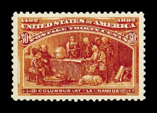 34 nh 239 image#239, 30c Columbian, an amazingly beautiful mint example of a stamp that clearly ranks as one of the finest, if not in fact the finest, mint 30c Columbians in existence, as each and every aspect of this spectacular stamp could not be improved upon, from its mathematically precise centering amid truly gigantic jumbo margins, to its incomparable overall brilliance, with eye-arresting prooflike color and impression on immaculate paper, even its perforations all around are unusually uniform and intact, unblemished o.g. without a single gum bend or skip, never hinged, in a word - superb; a record realization is in store for this incredible stamp; 1999 PF certificate. (Image) $750.00