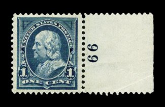 35 nh 247 image#247, 1c Blue, an eye-arresting right sheet-margin plate no. 99 single, with extraordinarily large and wonderfully well balanced margins all around, brilliantly fresh, strong rich color and impression, o.g., n.h., extremely fine gem; 1998 PF certificate. (Image) $200.00